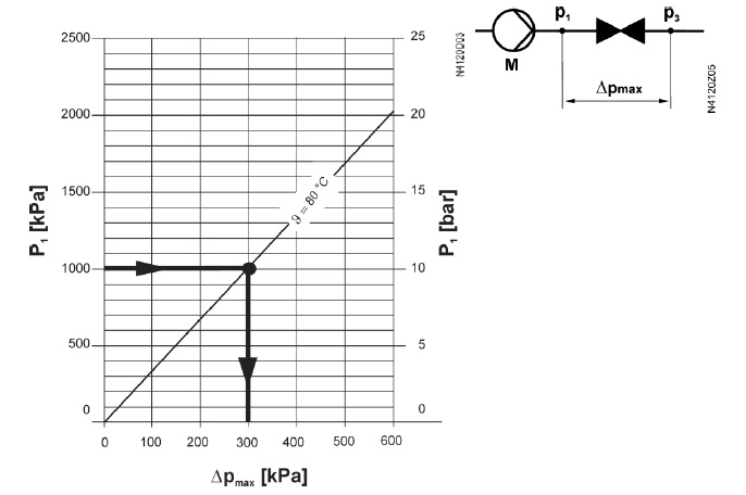 要避免冷凍水循環(huán)中的氣蝕現(xiàn)象,需要保證閥門(mén)出口有足夠的背壓,例如,在換熱器后加裝節(jié)流閥。按照下面的流量曲線圖中的 80 °C 曲線選擇閥門(mén)的最大壓降。